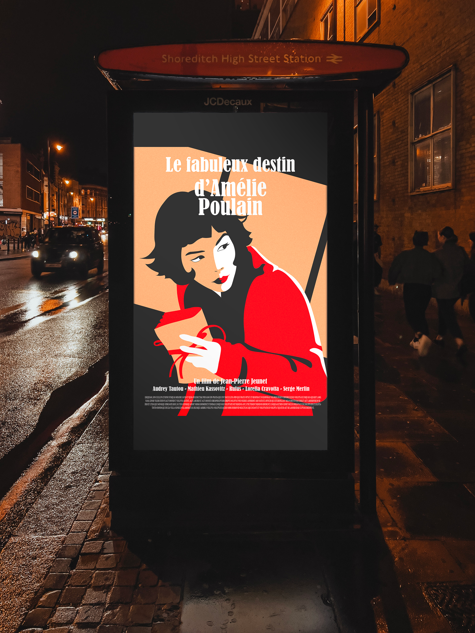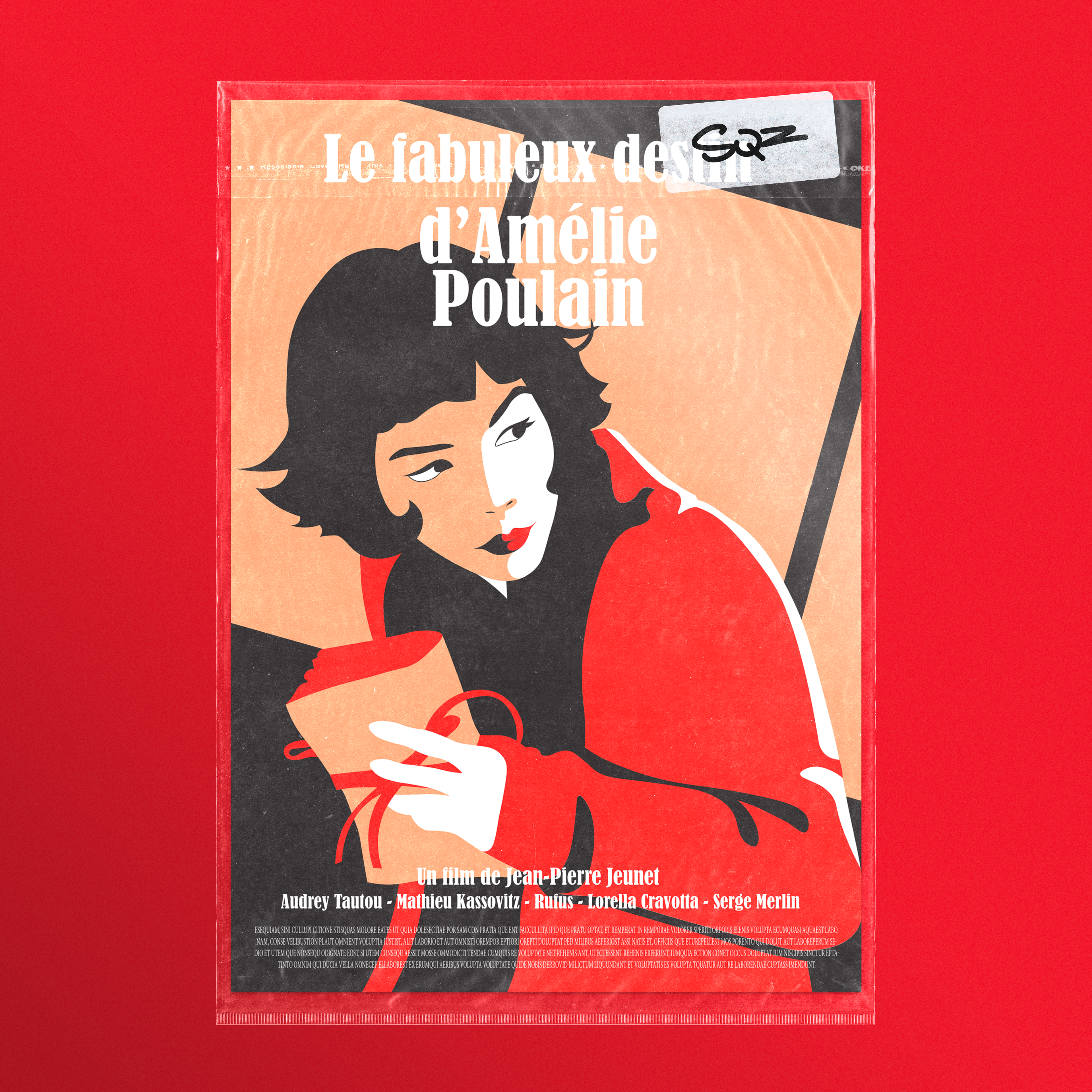 A reimagined movie poster for Amélie in flat illustration, using no more than three colors. By shifting the original whimsical romance into the mood of a suspense thriller.